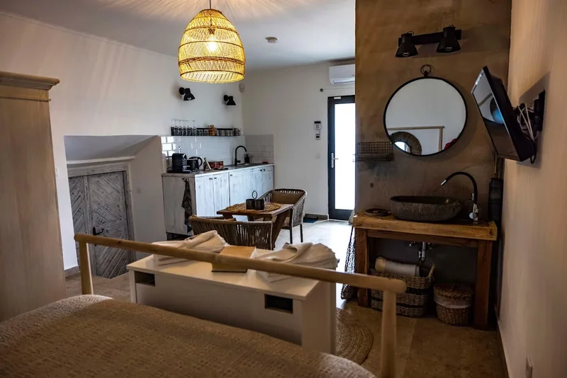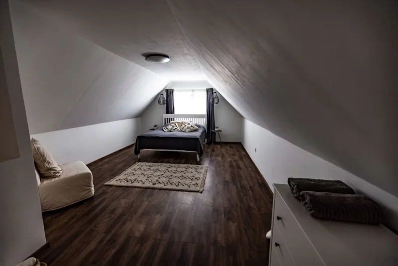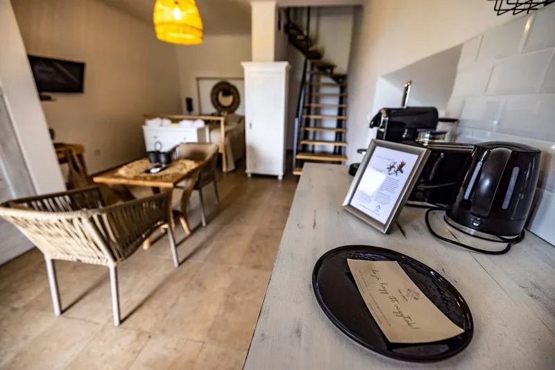 Kétszintes présház, két franciaággyal és egy kihúzható fotelággyal — rugalmas elrendezés, amely pároknak, családoknak vagy baráti dtársaságoknak egyaránt megfelel. Az előkert hangulatos sarkot ad a reggeli kávékhoz és esti beszélgetéshez.