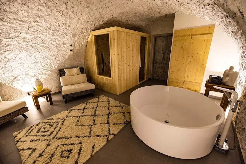 A 7. présház vendégei a szomszéd 6-os házzal közösen használják a wellness pincét — 3 személyes infraszauna, merülőkád és egy kényelmes pihenő sarok, kizárólag e két ház lakói számára.